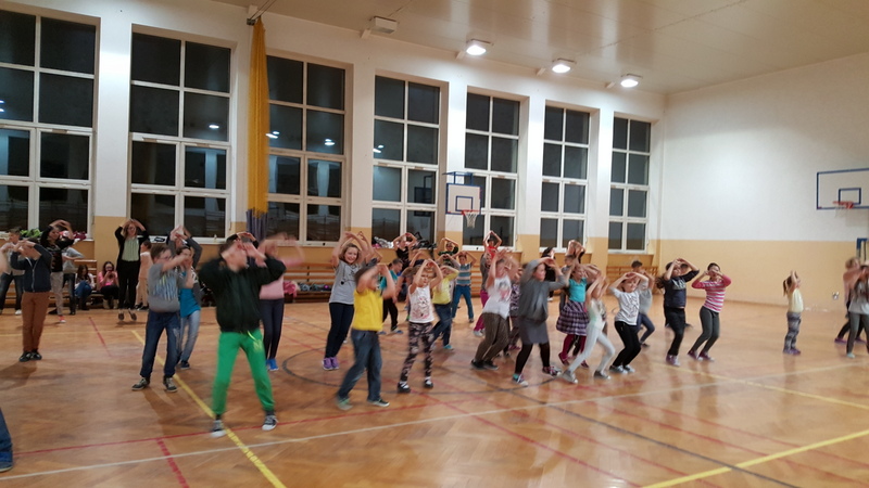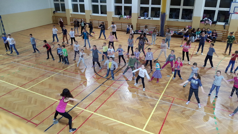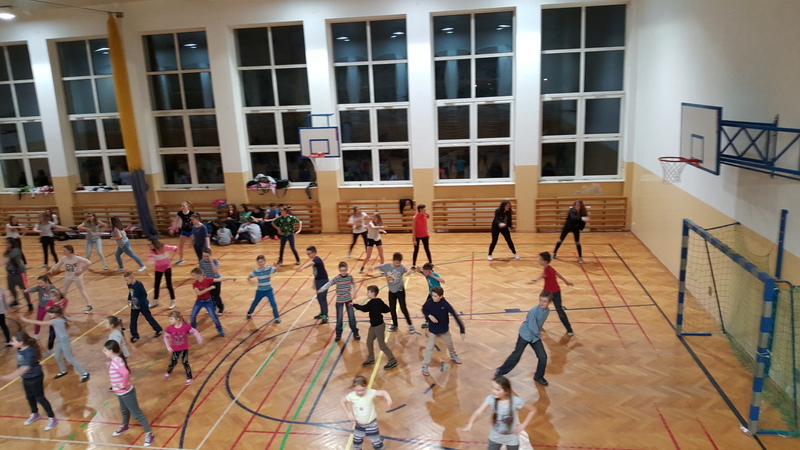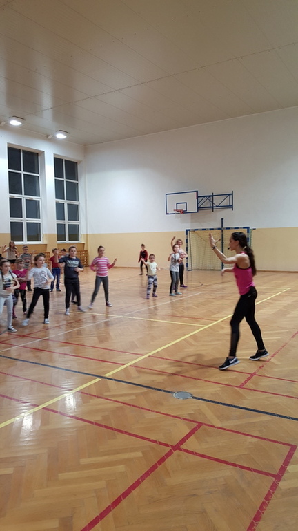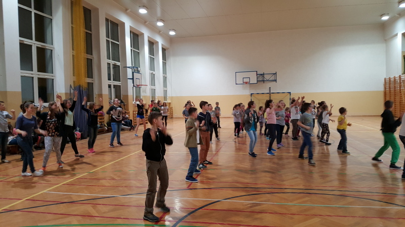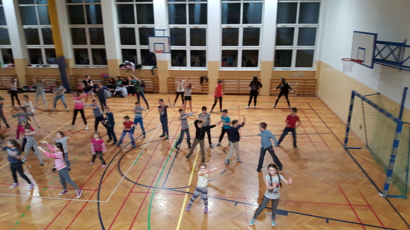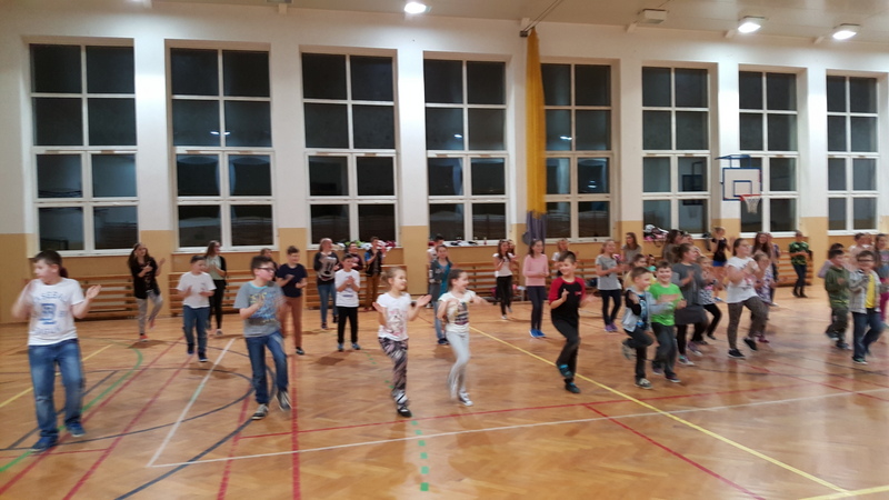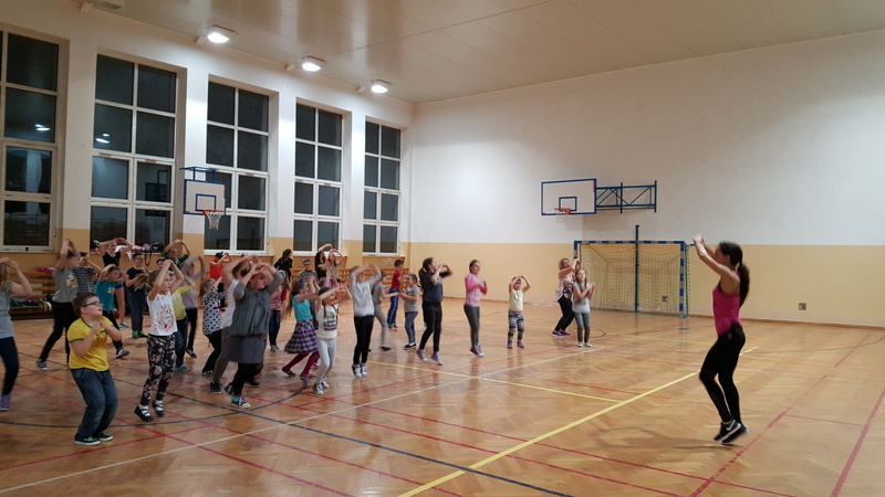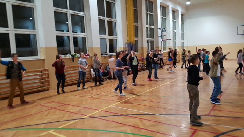 Pani Monika Majka uczyła nas kroków zumby i wszyscy razem gibko wyginaliśmy się w takt muzyki.