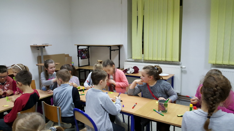 Potem doskonale bawiliśmy się oglądając teatrzyk Kamischibai. Tak nietypowe spotkanie z bohaterami baśni i bajek zaproponowała nam pani Dyrektor Miejskiej Publicznej Biblioteki w Dynowie Grażyna Paździorny. Niemałą zręcznością musieliśmy się wykazać podczas robienia zakładek do książek. Te papierowe cudeńka będą dla nas wspaniałą pamiątką.