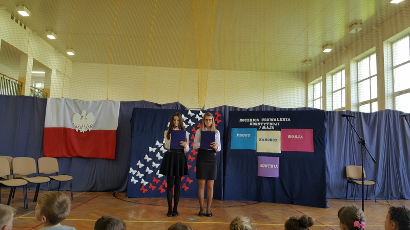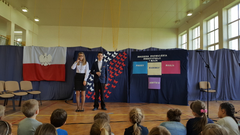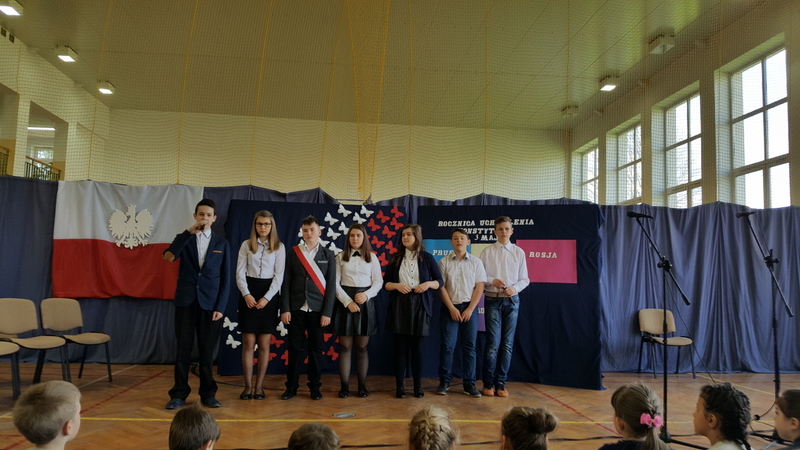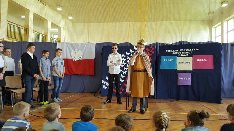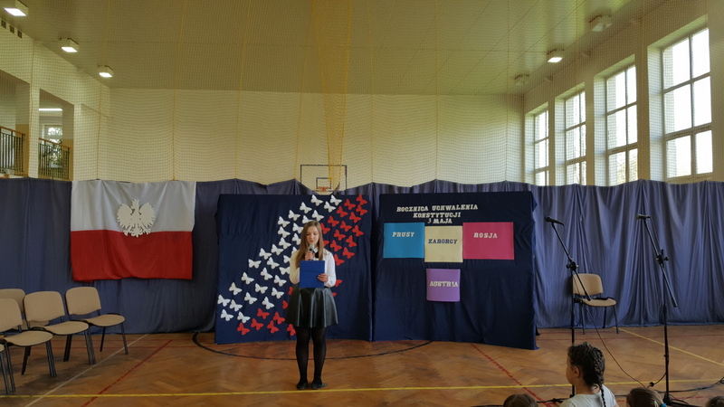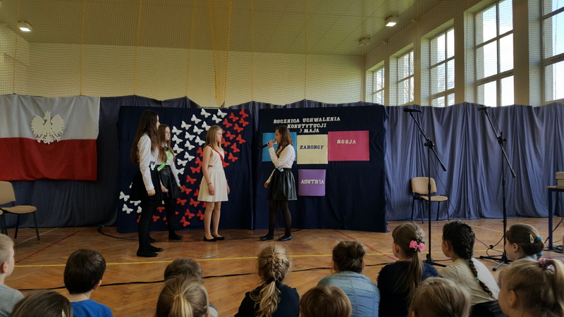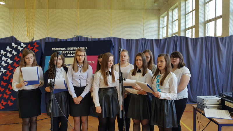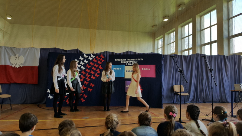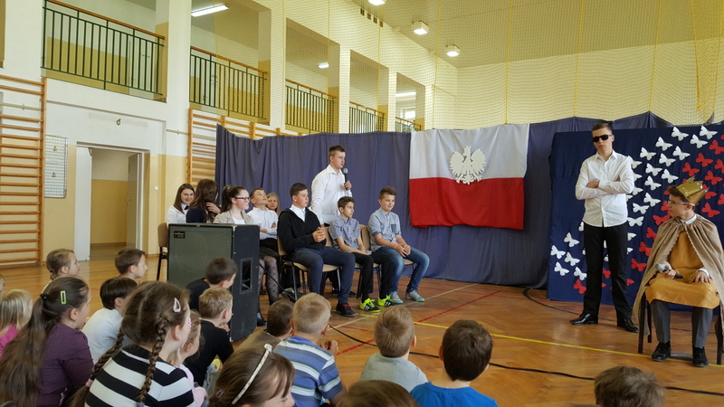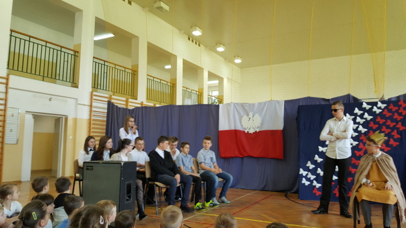 Podczas uroczystego apelu młodzież klasy I gimnazjum przypomniała powody obchodzenia świąt państwowych. Przedstawienie rozpoczęła informacja o święcie narodowym i fladze Rzeczypospolitej Polskiej. Lekko i zwiewnie w opowieść o kolorach emblematu naszego państwa wprowadziła nas para uczniów z klasy IV. Potem uwypuklono ważność tożsamości narodowej akcentowanej barwami, szczególnie w trudnych momentach historycznych (zabory, wojny).