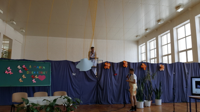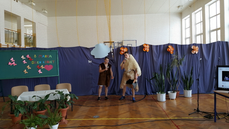 Następny punkt programu, który rozbawił widownię, to fragment filmu J. Machulskiego ukazujący rolę mężczyzn jako wybitnych uczonych- Kopernika, Einsteina… Po części żartobliwej nastąpiła część poważniejsza. Widownia mogła wysłuchać wierszy o zakazach w młodzieńczym wieku i wierszy o kobietach. Utwory poetyckie zostały połączone z przepięknym wykonaniem piosenek przez solistki zespołu wokalnego. Dziewczyny zaskoczyły wszystkich tak profesjonalnym wykonawstwem.