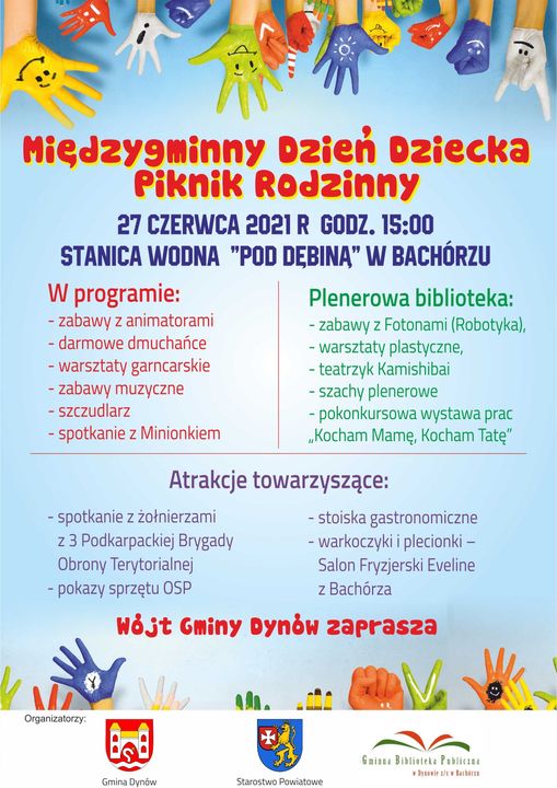 Wójt Gminy Dynów zaprasza wszystkie dzieci na Międzygminny Dzień Dziecka 27 czerwca 2021 - Stanica Wodna “Pod Dębiną” w Bachórzu.