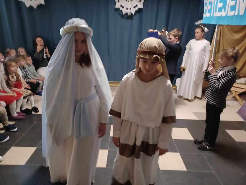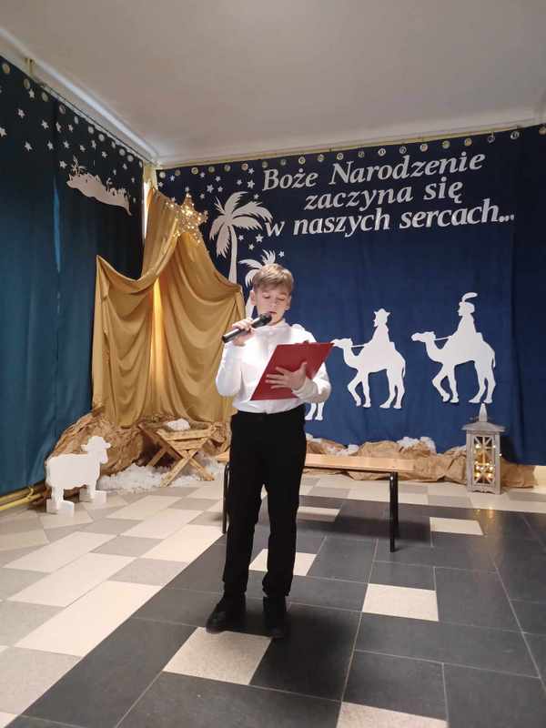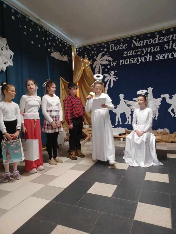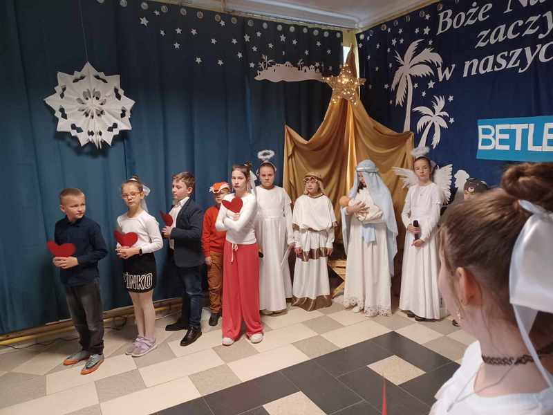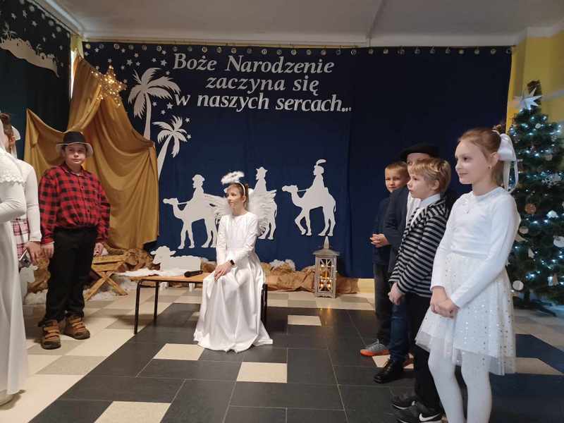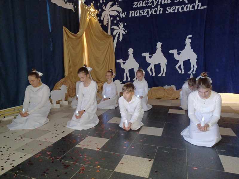 „Boże Narodzenie zaczyna się w naszych sercach” Pod takim tytułem 21 grudnia uczniowie klas 2, 4 i 5 w przejmujący sposób opowiedzieli historię Bożego Narodzenia. Wspólne kolędowanie, liryczne recytacje, taniec oraz serdeczne życzenia wprowadziły wszystkich w uroczysty przedświąteczny nastrój, pełen nadziei i radosnego oczekiwania.