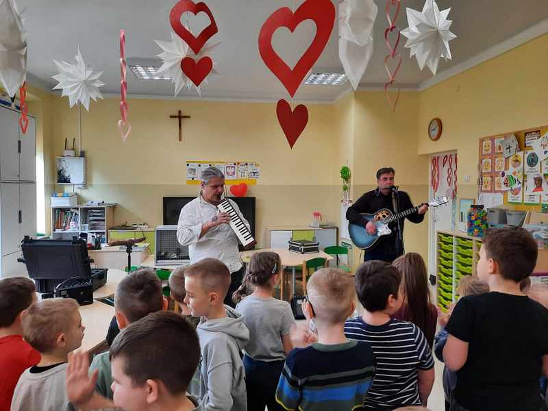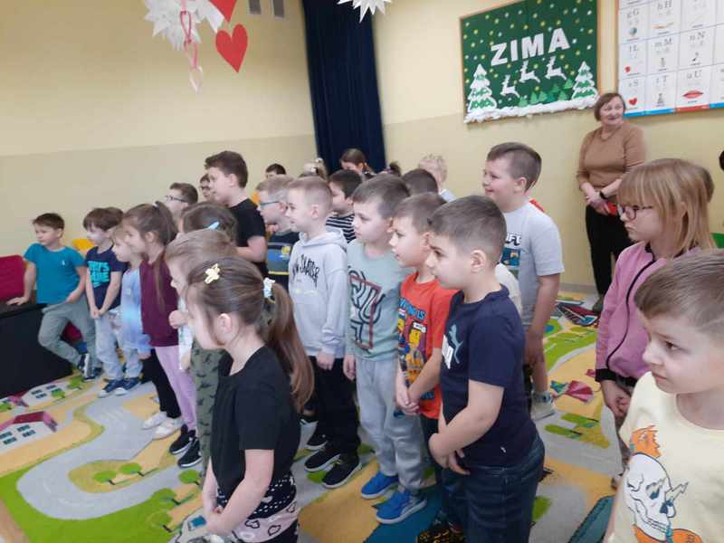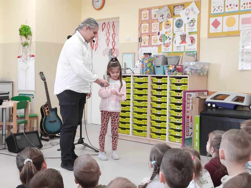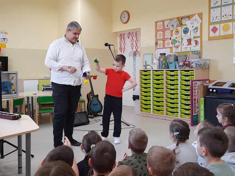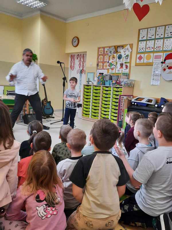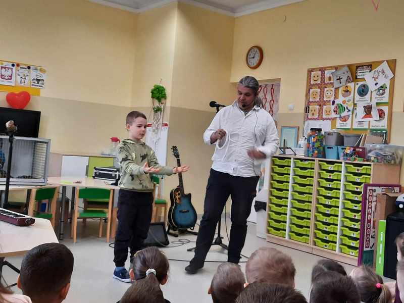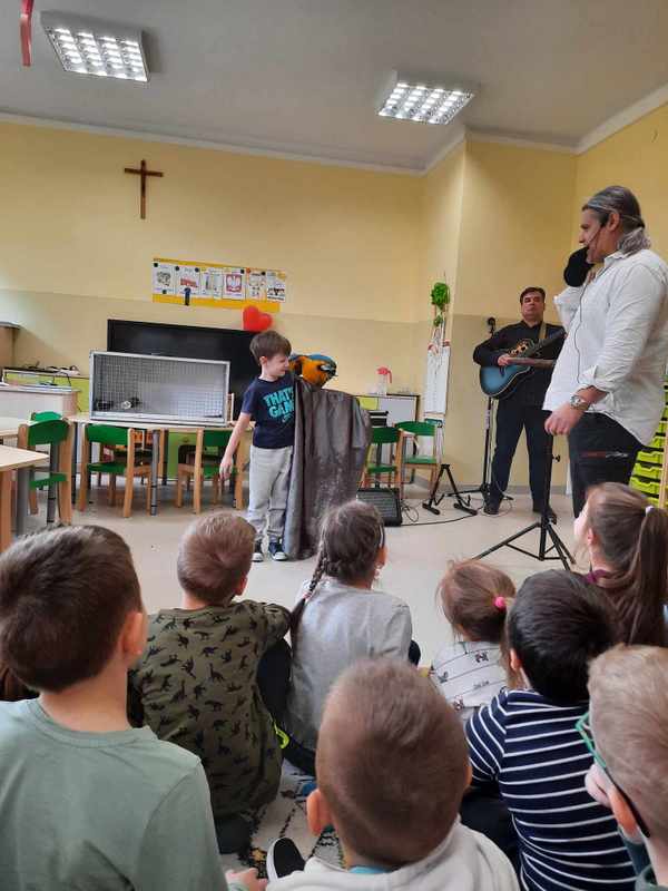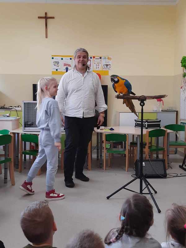19 lutego przedszkolaki i uczniowie kl. I wzięli udział w spotkaniu edukacyjno - rozrywkowym z papugą, muzyką na żywo i elementami iluzji. Dzieci dowiedziały się jak należy dbać o papugi w warunkach domowych, czym się je karmi, jak długo żyją i wiele innych ciekawostek. Najwięcej radości sprawiła dzieciom wypuszczana na salę papuga wykonująca polecenia swojego opiekuna. Całość przeplatana była wesołą, muzyką na żywo. Dzieci z pewnością na długo zapamiętają to ciekawe spotkanie.