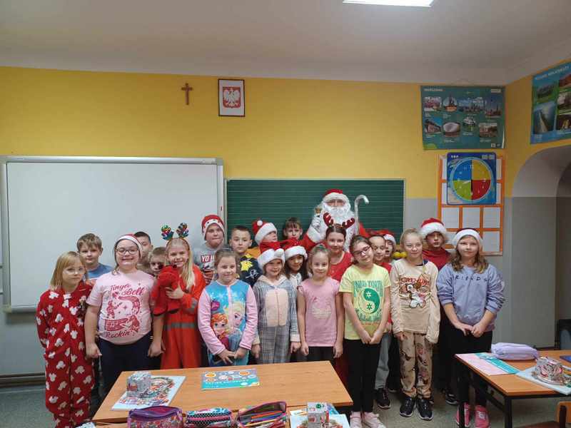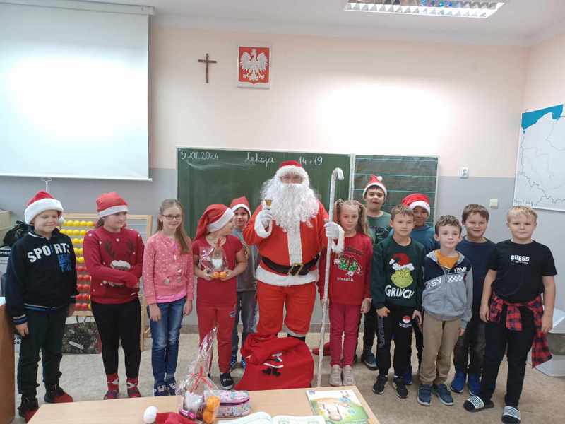 5 grudnia 2024 roku w naszej szkole mieliśmy wyjątkowego gościa – odwiedził nas sam św. Mikołaj! Było to niesamowite wydarzenie, które przyniosło wiele radości i uśmiechu zarówno dzieciom, jak i nauczycielom. Niezwykły gość przybył z workiem pełnym prezentów. Każda klasa miała okazję porozmawiać z nim, zrobić pamiątkowe zdjęcia, a nawet zaprezentować świąteczne wierszyki lub piosenki. W szkole unosił się świąteczny nastrój dzięki pięknym dekoracjom i dźwiękom kolęd.